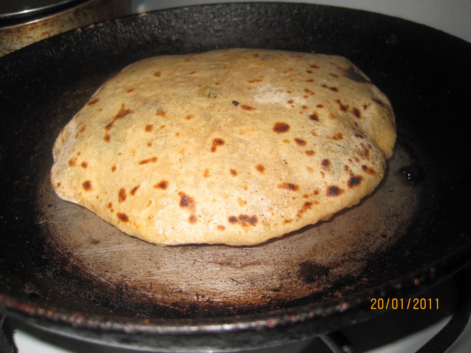 5. Place on a hot griddle, roast and drizzle oil, to shallow fry the parathas both sides on medium-low heat.