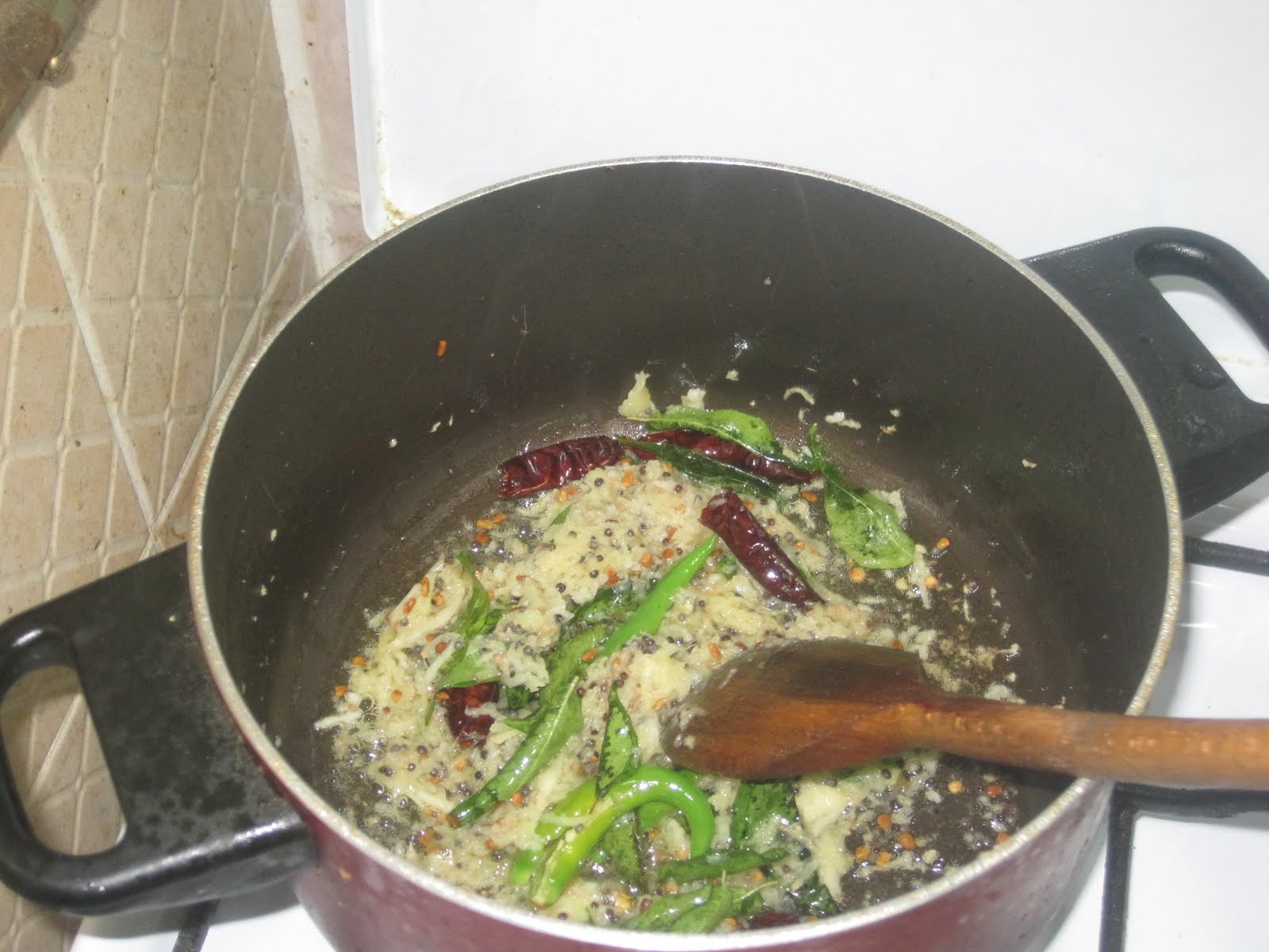 4. Once it crackle, curry leaves , crushed ginger garlic paste and saute for 3-4 minutes.