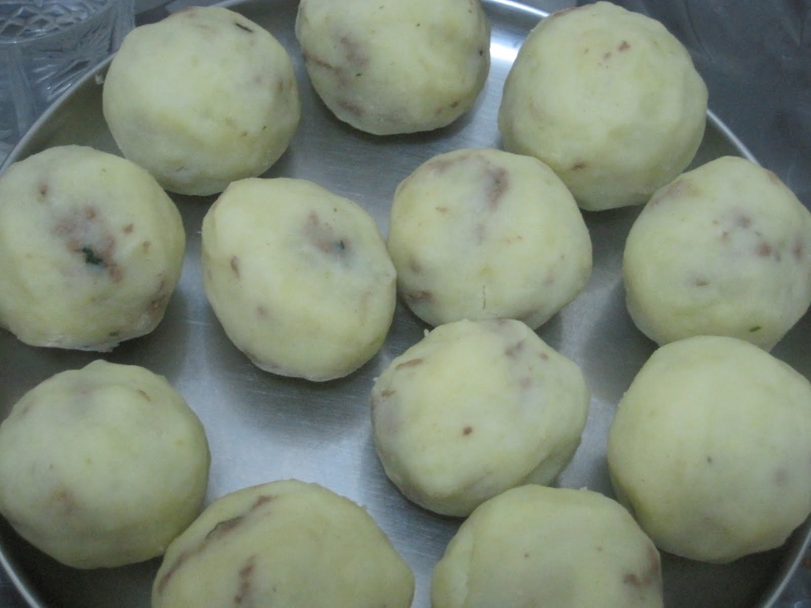9. Keep the one portion of the meat filling inside the flatten potato and roll to form a small ball