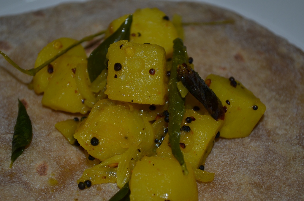 Potato bhaji used be our staple side dish with chapattis for dinners. And very rarely with pooris. And some times she roll it in a chapatti and give it to us. When ever she prepares it I stand next her. I even remember the tawa on which she used prepare it. 😛 .
