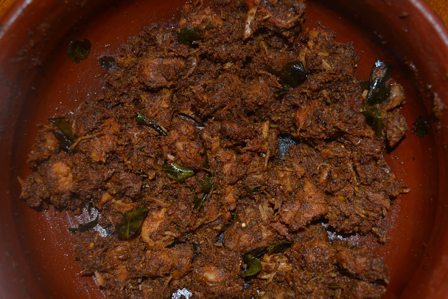 4. Marinate the cleaned beef with chili powder, coriander powder, turmeric powder, chopped onion, ginger, garlic,curry leaves and salt. Leave it closed for 15 minutes at least
