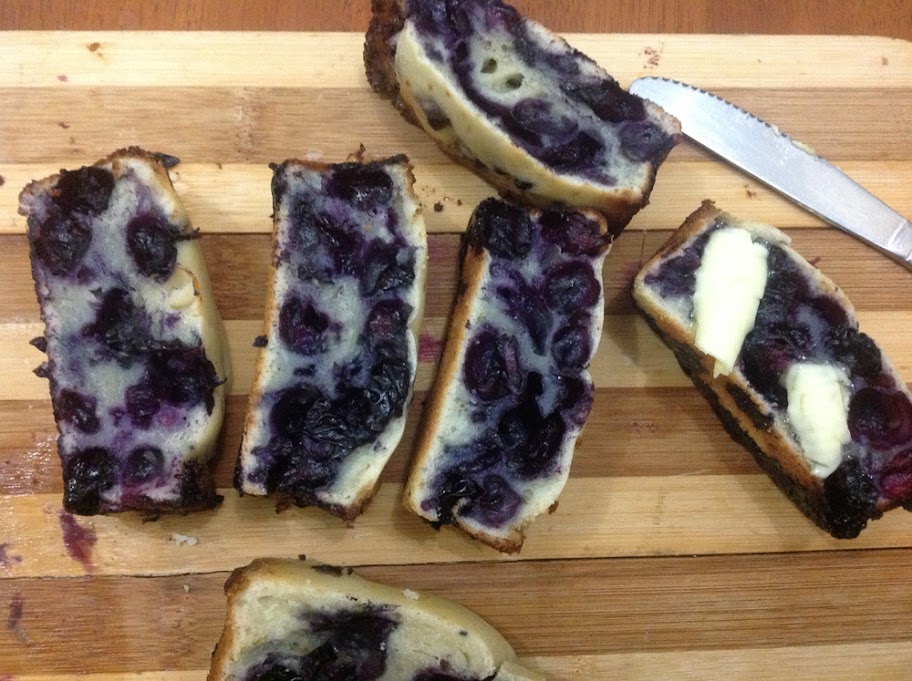 4. Add flour, baking powder, sugar, and blueberries. Fold in.