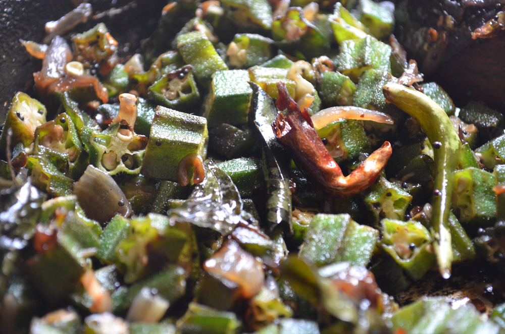 6. Stir in the lady’s finger and fry well. Add salt and stir fry.