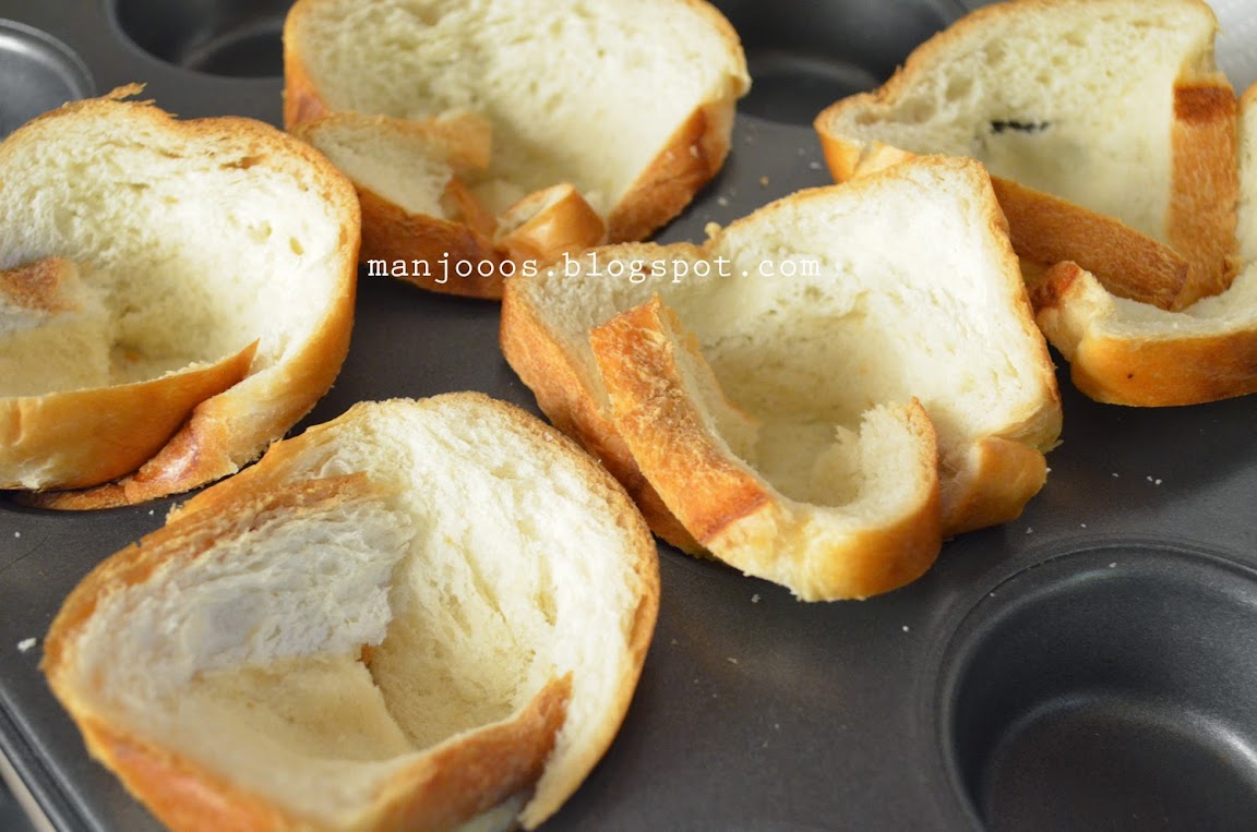- Press the bread pieces inside your muffin tray.