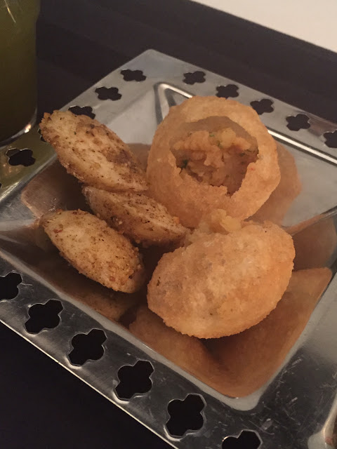 Aam Panna is one of the welcome drinks served in North India. But this deconstructed version was a new experience for me. Though I have seen the techniques in cookery shows. It was first time I am experiencing it. The smoking aam panna settled once the basil mojito was poured on top..Now, the tasting time.. After few sips, I used spoon to taste the malai aam panna which was floated on top. It was so refreshing and creamy. It has different textures of Aam Panna .It tastes so good. Well that was a good start.