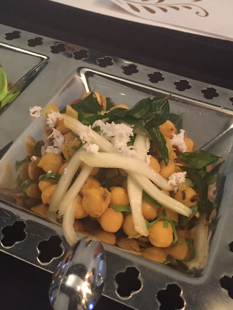This platter had a Potato lollipop, a Samosa and a Potato cake (Aloo tikki) served on top of Chana (Chickpeas) masala. This platter was served along with yogurt sphere on a spoon and a refreshing laban shot. The idea was to start with the yogurt sphere, then have the potato platter and finish off with laban shot…